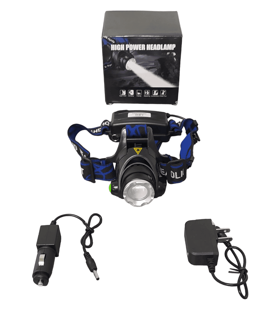 • Linterna frontal de alta luminosidad con ajuste en cabeza por correa elástica. Recargable, incluye cargador de pared y cargador de carro.  Tres opciones de alumbrado: fuerte, medio e intermitente.